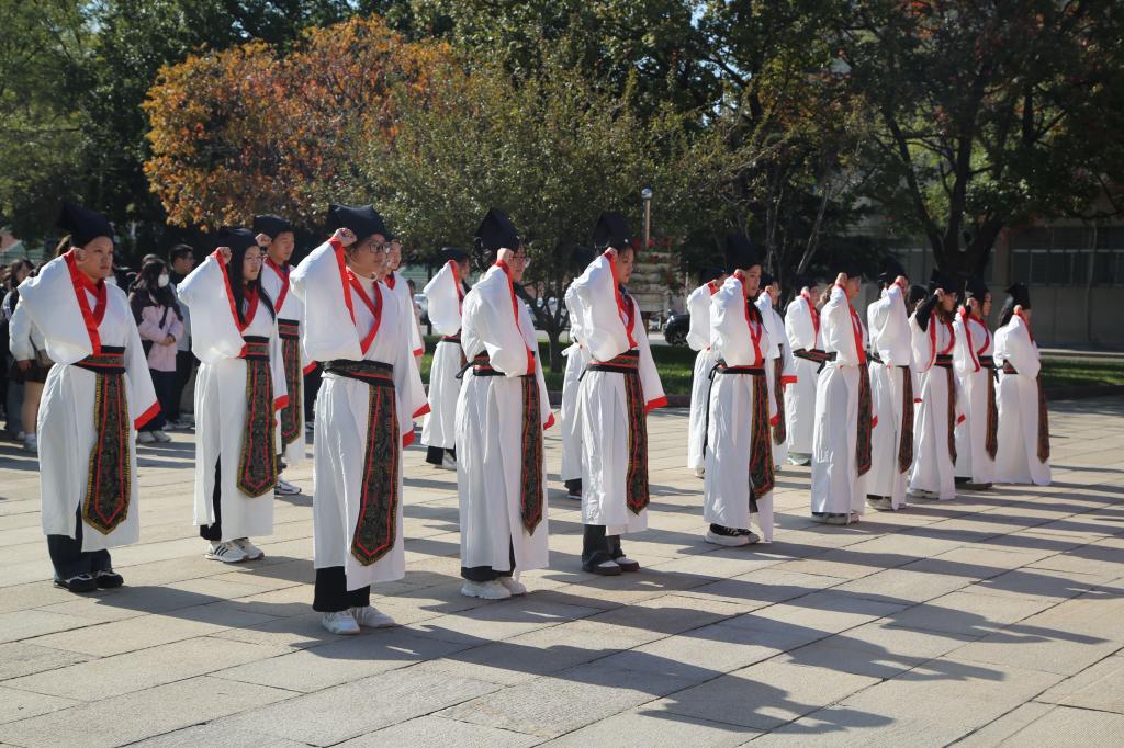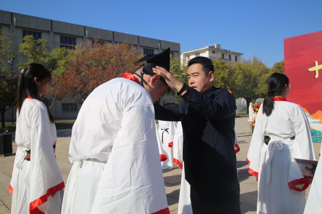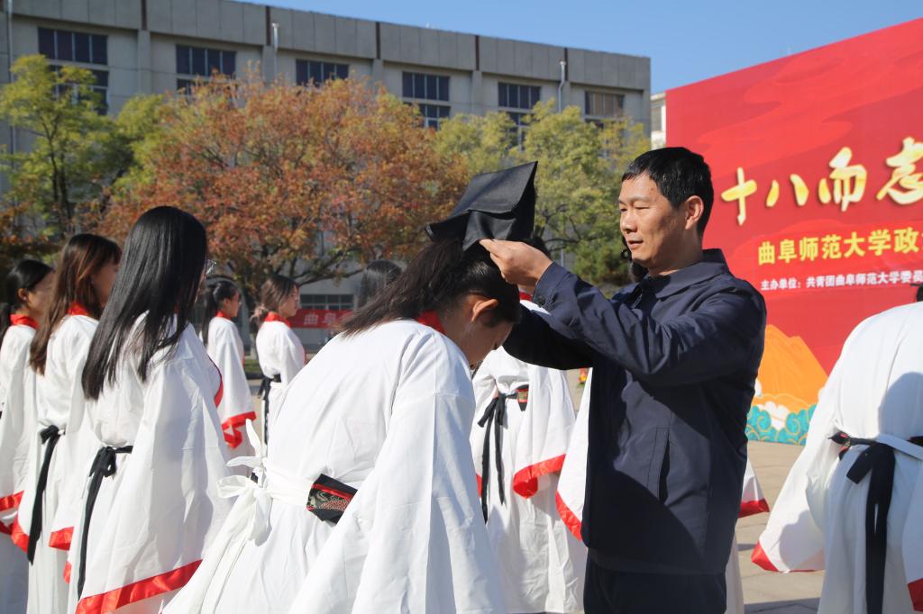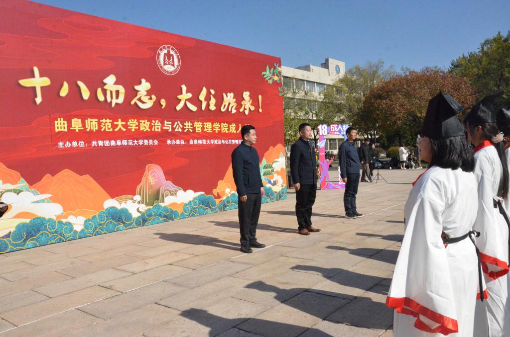 十八而至,大任始承、道义不辞,百名政院学子肃立孔子像前,面谒先师,以一加,一醴,三拜行成人之礼。张忠凯、马腾、王元如面谒至圣先师,行三鞠躬礼,并按照传统为读漫屋