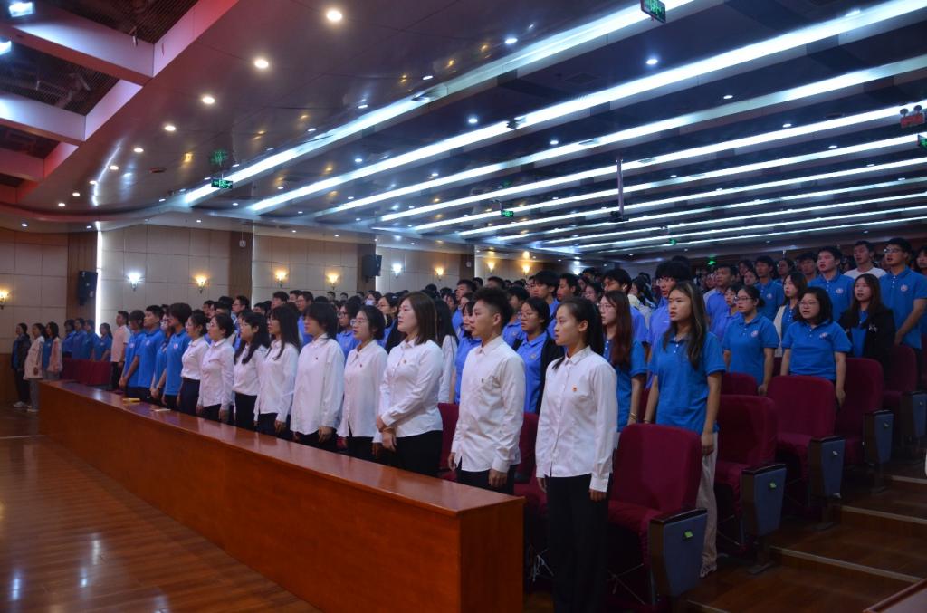 大会在庄严肃穆的国歌声中拉开帷幕,全体与会师生肃立,齐唱国歌。