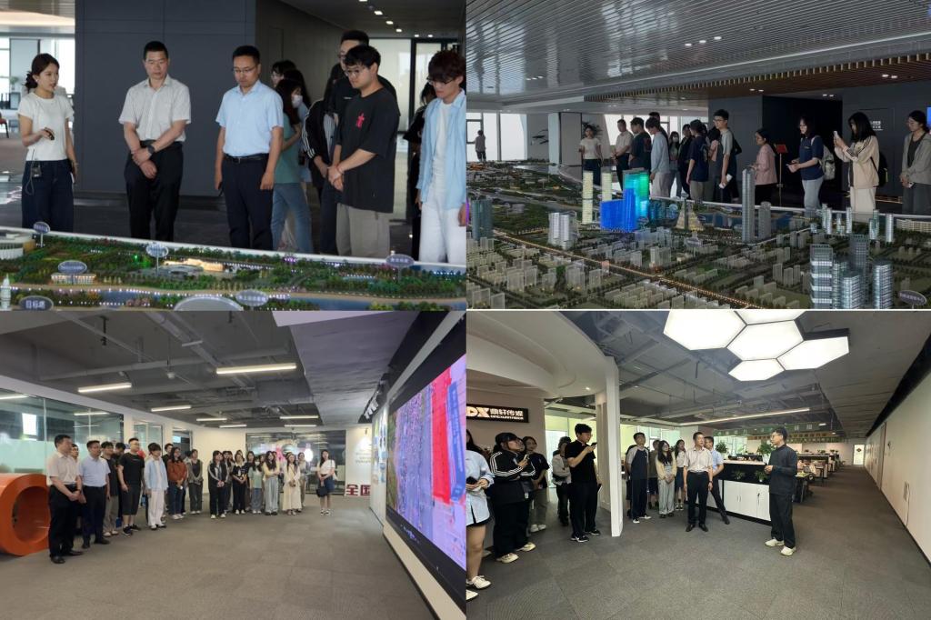 知行课堂聚焦 “知行合一”,讲座结束后,在东港区团委书记全德祜的带领下,张忠凯组织同学们赴日照市财富中心鼎轩传媒实地研学。企业负责人通过智能化直播场景演示,直观展现人工智能对传媒业态的重塑过程,呈现传统行业转型升级的鲜活案例。全德祜书记结合企业实际,以“政策解读+案例剖析”形式,详细介绍东港区“青鸟计划”人才工程与大学生创新创业扶持政策,热忱邀请青年学子扎根日照逐梦未来。在中央活力区53楼观景台,同学们通过沙盘模型与多媒体展示,全面了解日照市科技发展现状与未来规划。张忠凯结合城市发展实际,生动阐释科技在城市建设、管理和发展中的关键作用,激励同学们以探索实践为纽带,更新认知与思维,实现“知”与“行”的紧密结合。