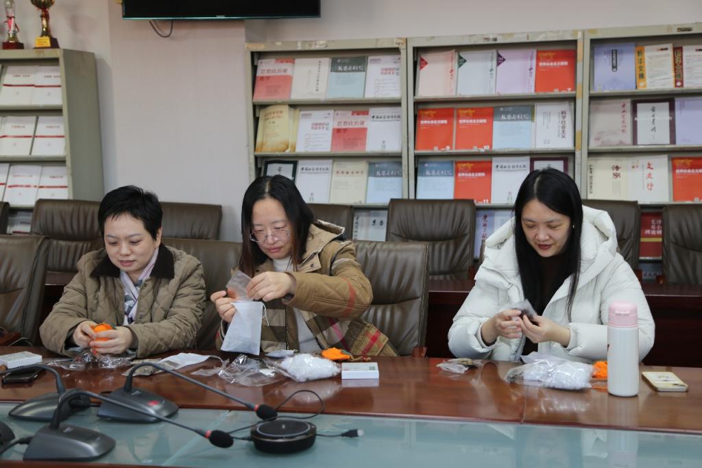 随后,在“生活美学”体验环节,工会为教师们准备了“事事如意”柿子香包的制作材料并向其介绍了艾草及4种疏肝解郁的药材香料,教师们在制作中专注地挑选材料、构思设计,在沉浸式创作中舒缓压力、收获成就感。