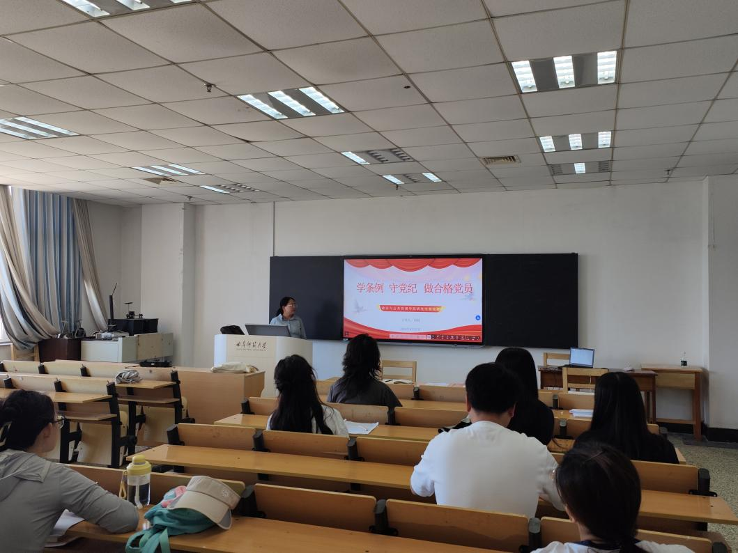 党支部书记徐莉以“学条例,守党纪,做合格党员”为主题,讲授党纪学习教育专题党课。首先带领大家学习了习近平总书记系统阐述加强党的纪律教育的重大意义、内容对象、方法途径和目标任务的内容;随后对《中国共产党纪律处分条例》的时代背景、特点、亮点和规定要求进行了重点学习,教育引导党员同志要以案为鉴,以案为戒,准确把握“6项纪律”规定要求,坚持“吾日三省吾身”,使纪律和规矩在心中真正立起来、严起来;最后号召支部全体党员应力学笃行,坚守底线,做一名合格党员,把学习《条例》作为必修课、常修课,真正做到学懂弄通、知行合一。